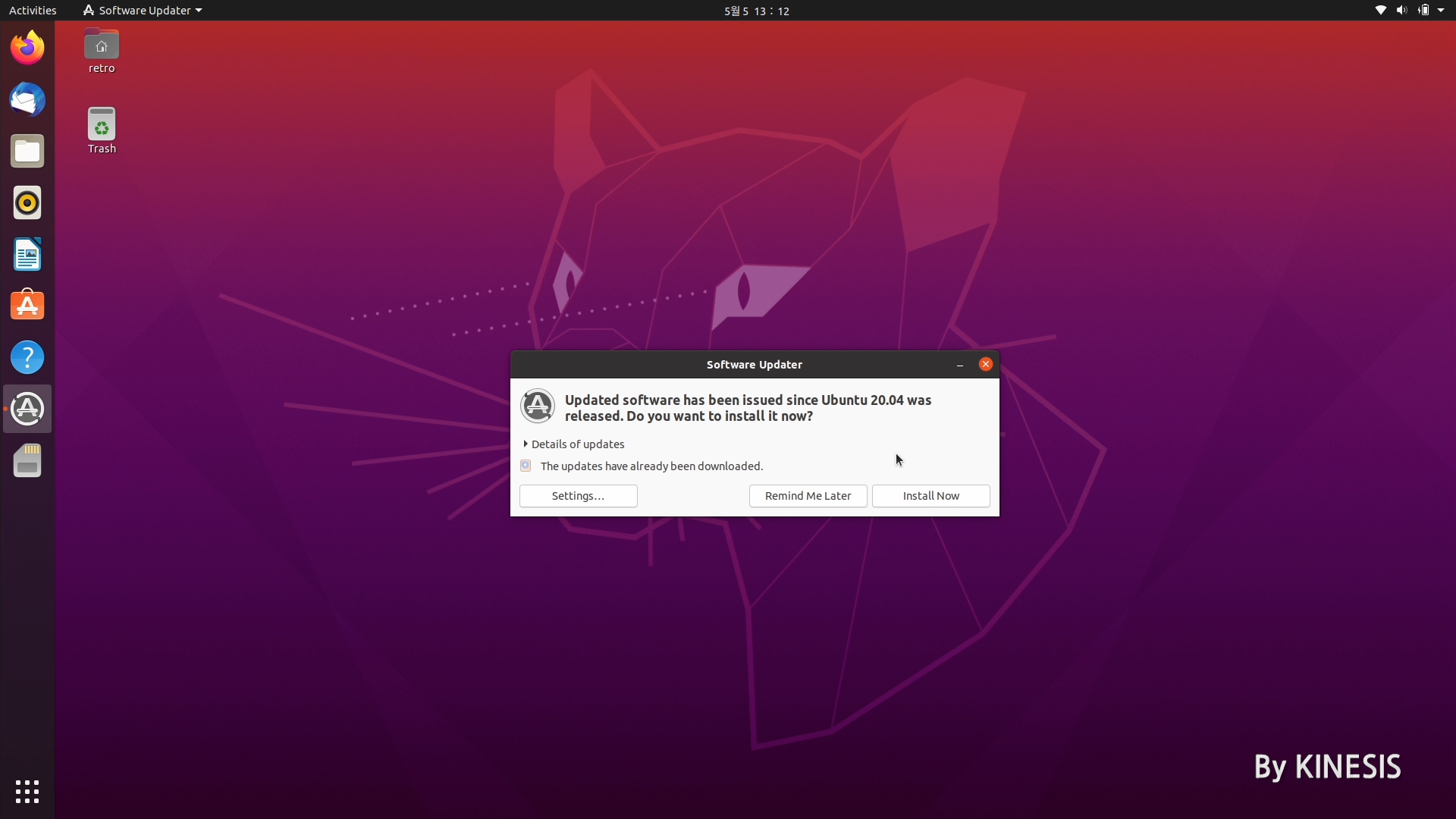 네트워크가 연결된 상태라면 위와 같이 소프트웨어 업데이트(Software Updater)가 나타나는데 Install Now 버튼을 클릭해서 간단한 패치 등을 업데이트 해줍니다.