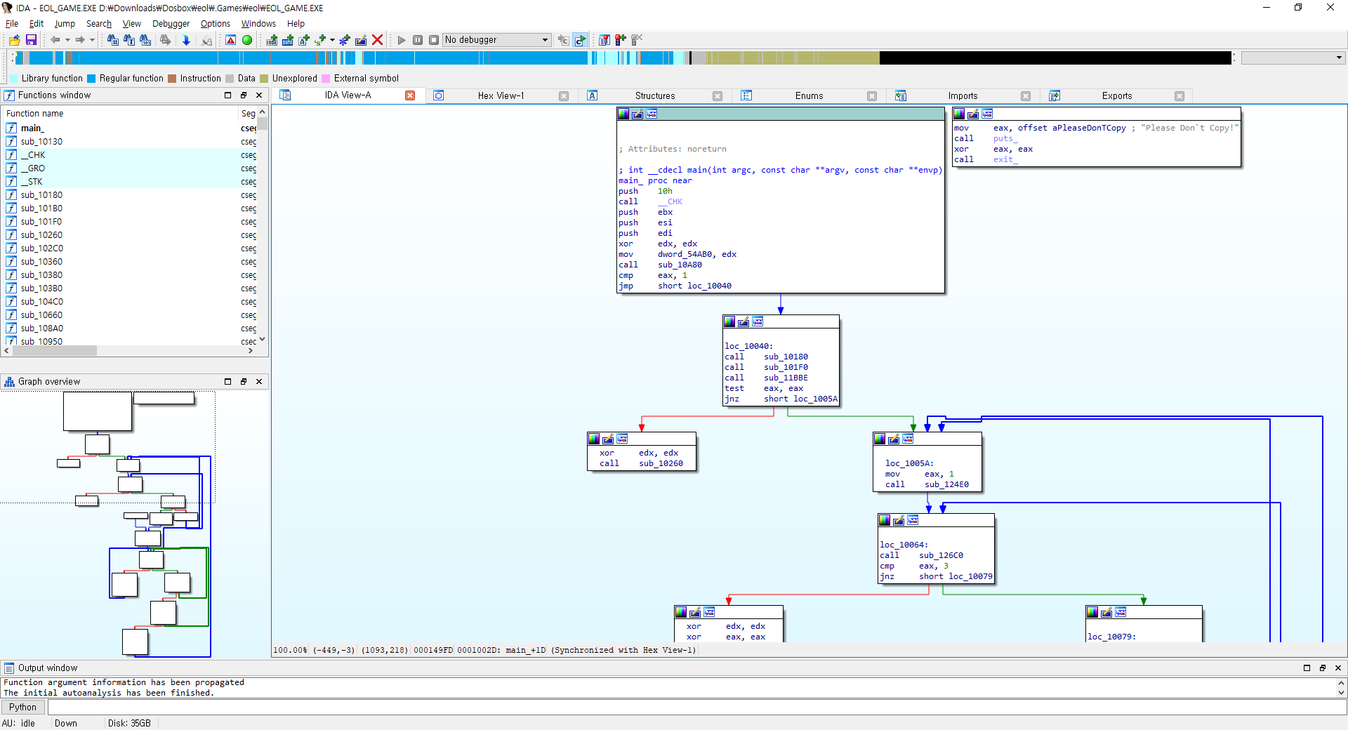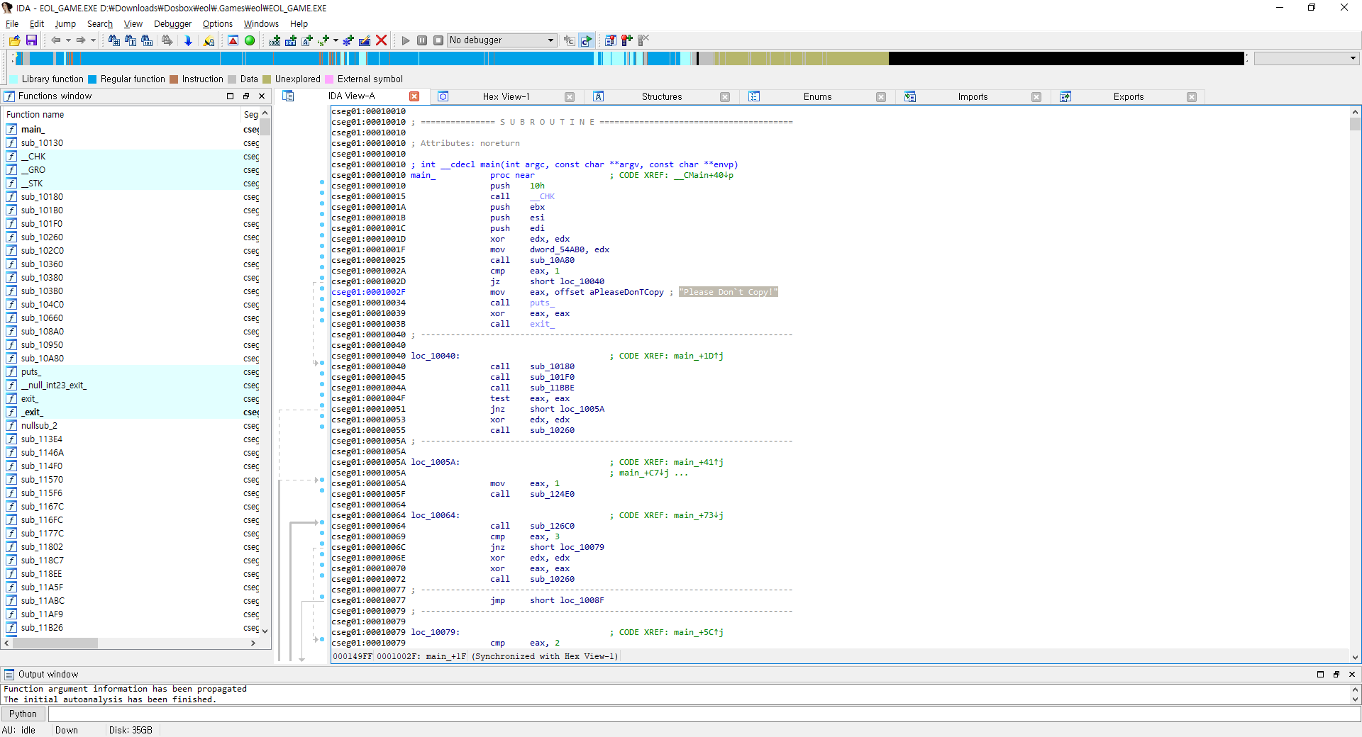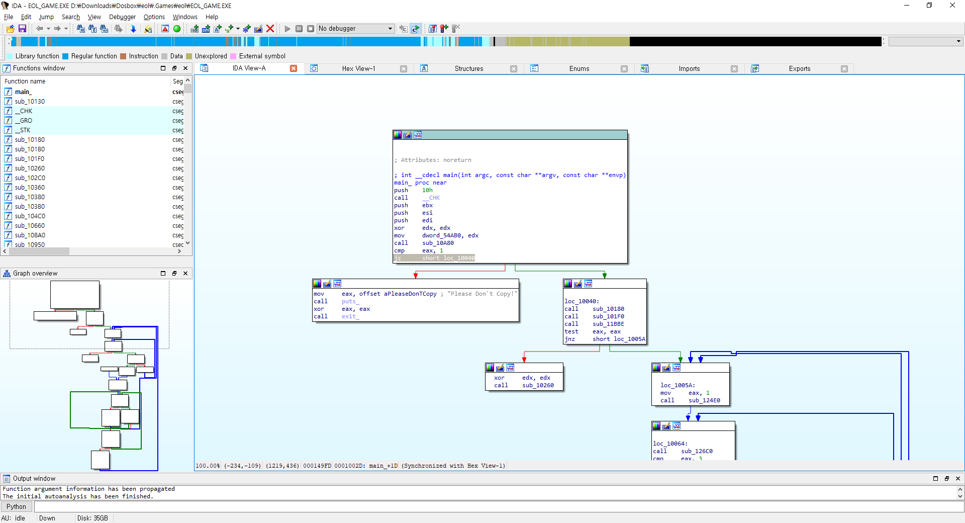 이런데 쓰라고 구매했던 것은 아니지만, 리버스 엔지니어링 연습한다고 스스로를 정당화 하면서, 관련 도구인 IDA를 실행시켜 eol_game.exe 파일을 불러온다.