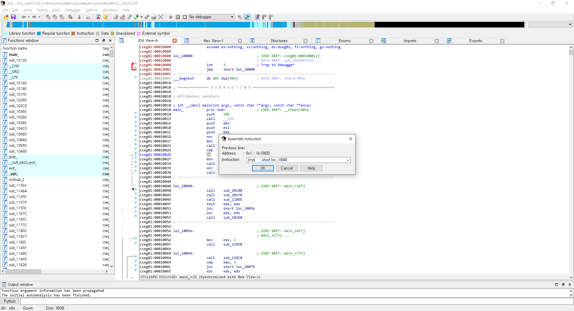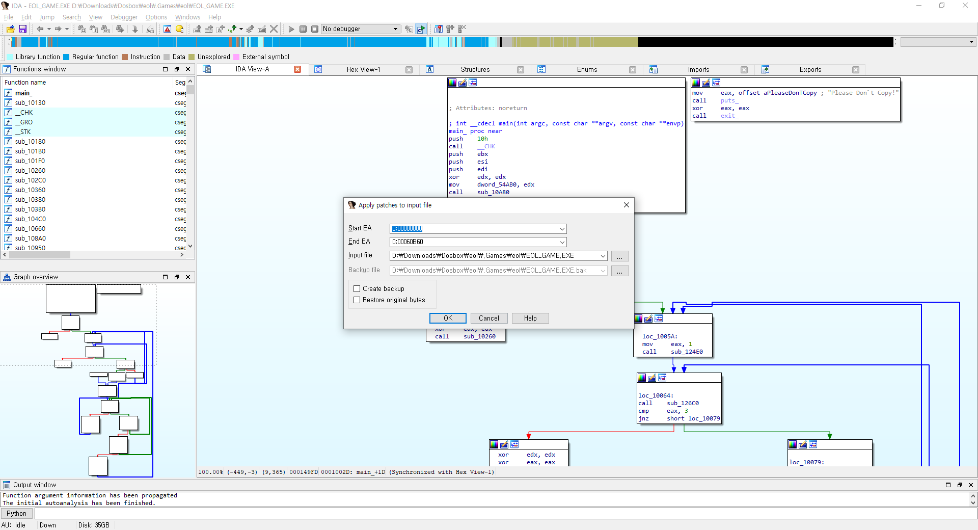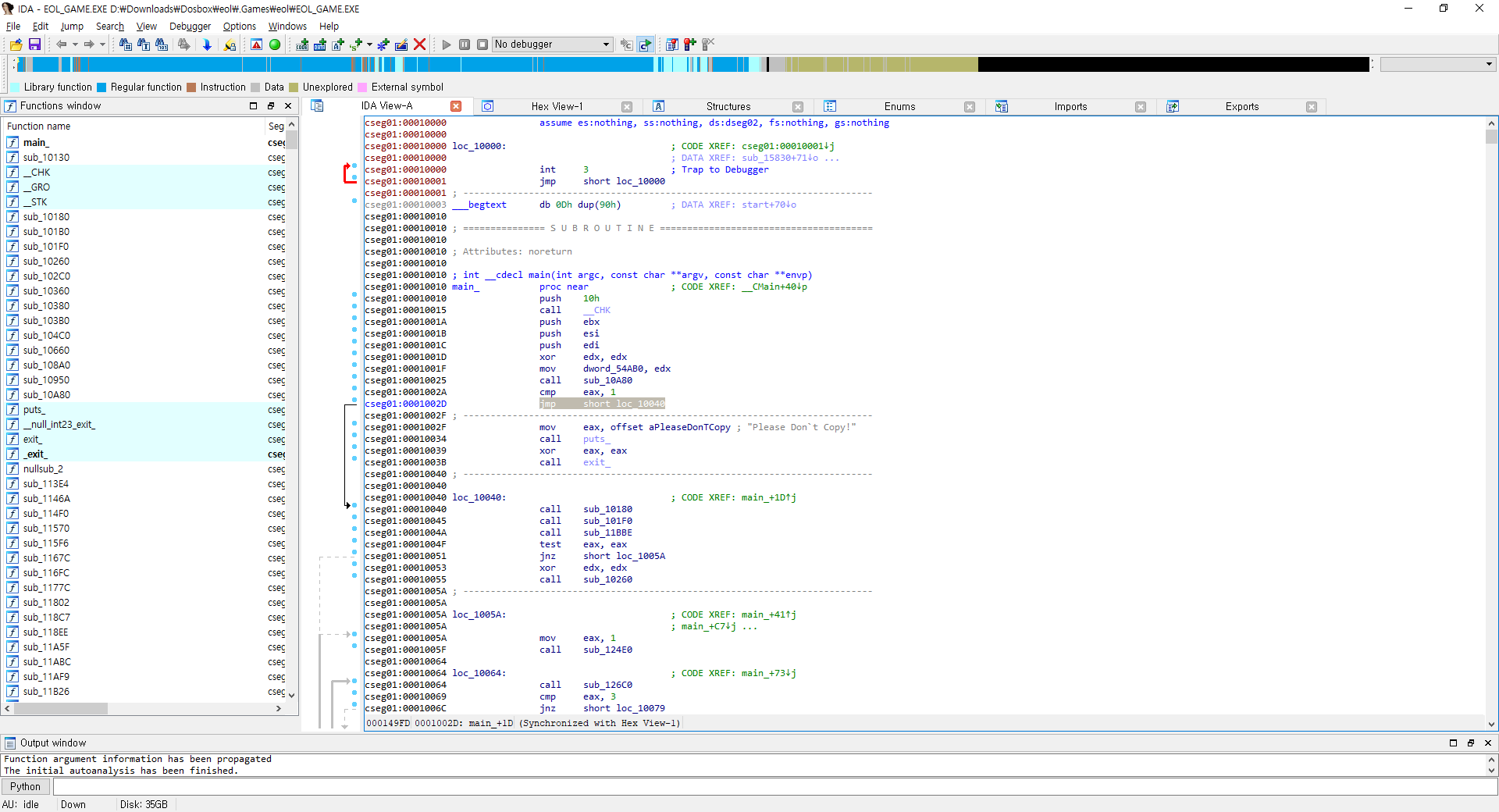 이런데 쓰라고 구매했던 것은 아니지만, 리버스 엔지니어링 연습한다고 스스로를 정당화 하면서, 관련 도구인 IDA를 실행시켜 eol_game.exe 파일을 불러온다.