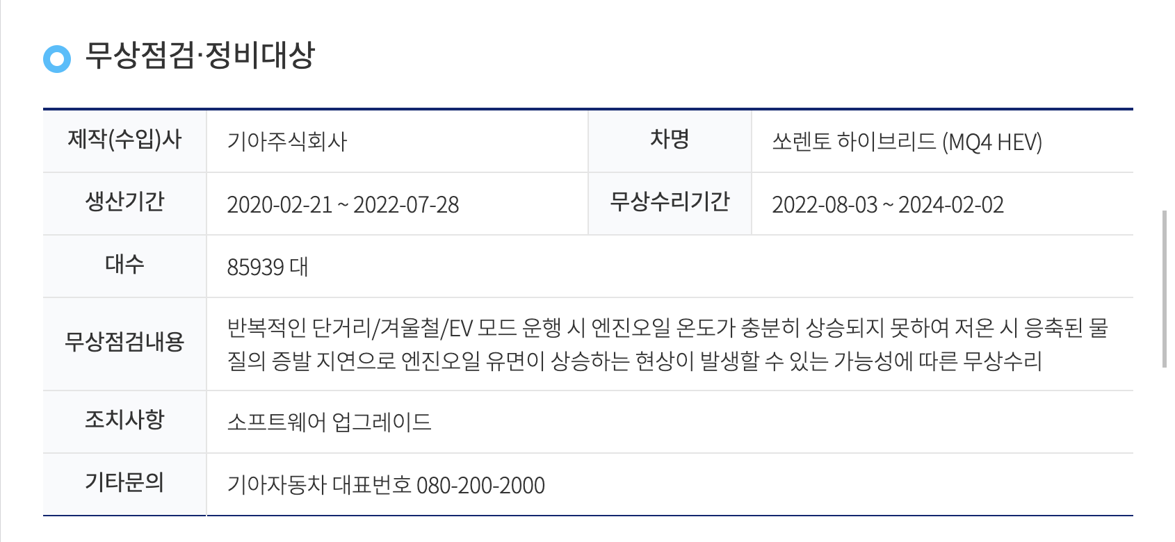실제로 국토교통부의 자동차리콜센터 내용을 보면 글을 작성하고 있는 2023년 1월 28일 기준으로 쏘렌토 하이브리드에 대한 리콜현황은 존재하지 않고, 무상점검 및 정비대상에 위의 이미지와 같은 게시글 하나만 올라와 있는 상태이다.