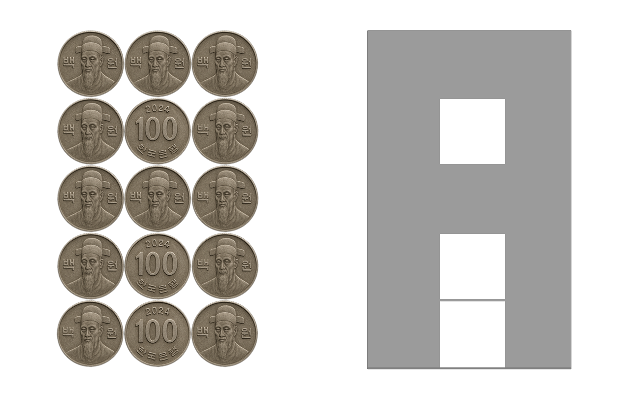 이번에는 동전을 이용해서 좀 다른 가정을 해볼까요? 동전 15개를 이용해서 가로로 3개씩 세로로 5개씩 나열했다고 가정해봅시다. 이제 우리는 이걸로 간단하게 알파벳이나 숫자를 표현할 수도 있을 겁니다.