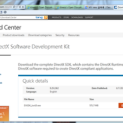 DirectX SDK (Software Development Kit) 를 이용한 프로젝트 개발을 위해서는 DirectX SDK 를 설치해야 한다. http://www.microsoft.com/download/en/details.aspx?displaylang=en&id=6812 위의 주소로 접속하면 DOWNLOAD 버튼을 통해 최신버젼의 다이렉트X SDK 를 받을 수 있다. 이렇게 받은 DirectX SDK 를 더블클릭하여 실행하여 설치를 진행한다. 일반적으로는 "C:\Program Files\Microsoft DirectX SDK (June 2010)" 또는 "C:\Program Files (x86)\Microsoft DirectX SDK (June 2010)" 와 같은 경로에 설치되는데, 필요도에 따라..
