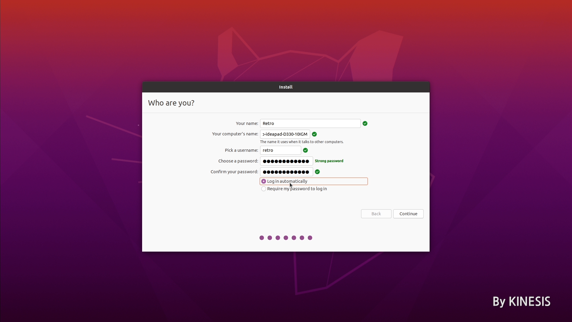 앞으로 Ubuntu 환경에서 사용할 사용자 계정 및 컴퓨터 명을 설정하는 단계입니다. name과 적절한 명칭을 입력해 주시고, 패스워드를 입력해 줍니다. 패스워드 입력 없이 로그인을 해서 사용하고 싶으신 사용자 분들은 "Log in automatically" 를 선택하고 Continue 버튼을 클릭해줍니다.
